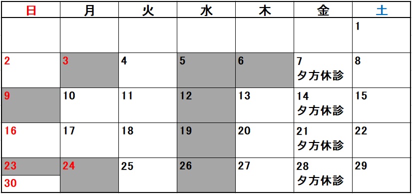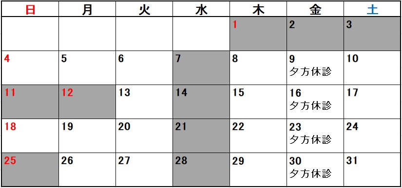 休診日 :水曜日・祝日、金曜日夕診、土曜日夕診、日曜日午後
