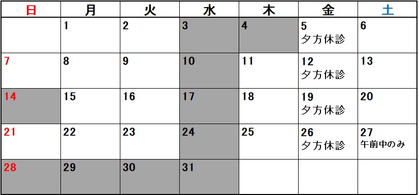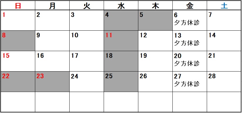 休診日 :水曜日・祝日、金曜日夕診、土曜日夕診、日曜日午後
